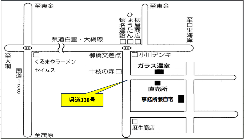 外房線大網駅よりバスで柳橋で下車。柳橋交差点より徒歩約12分。